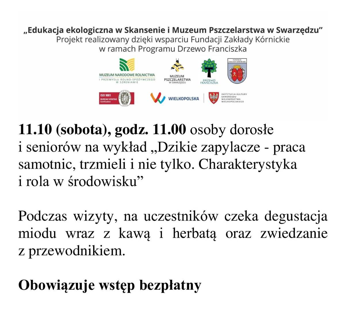 W sobotę, 11 października o godz. 11:00, Skansen i Muzeum Pszczelarstwa w Swarzędzu zaprasza osoby dorosłe i seniorów na wykład „Dzikie zapylacze - praca samotnic, trzmieli i nie tylko. Charakterystyka i rola w środowisku"