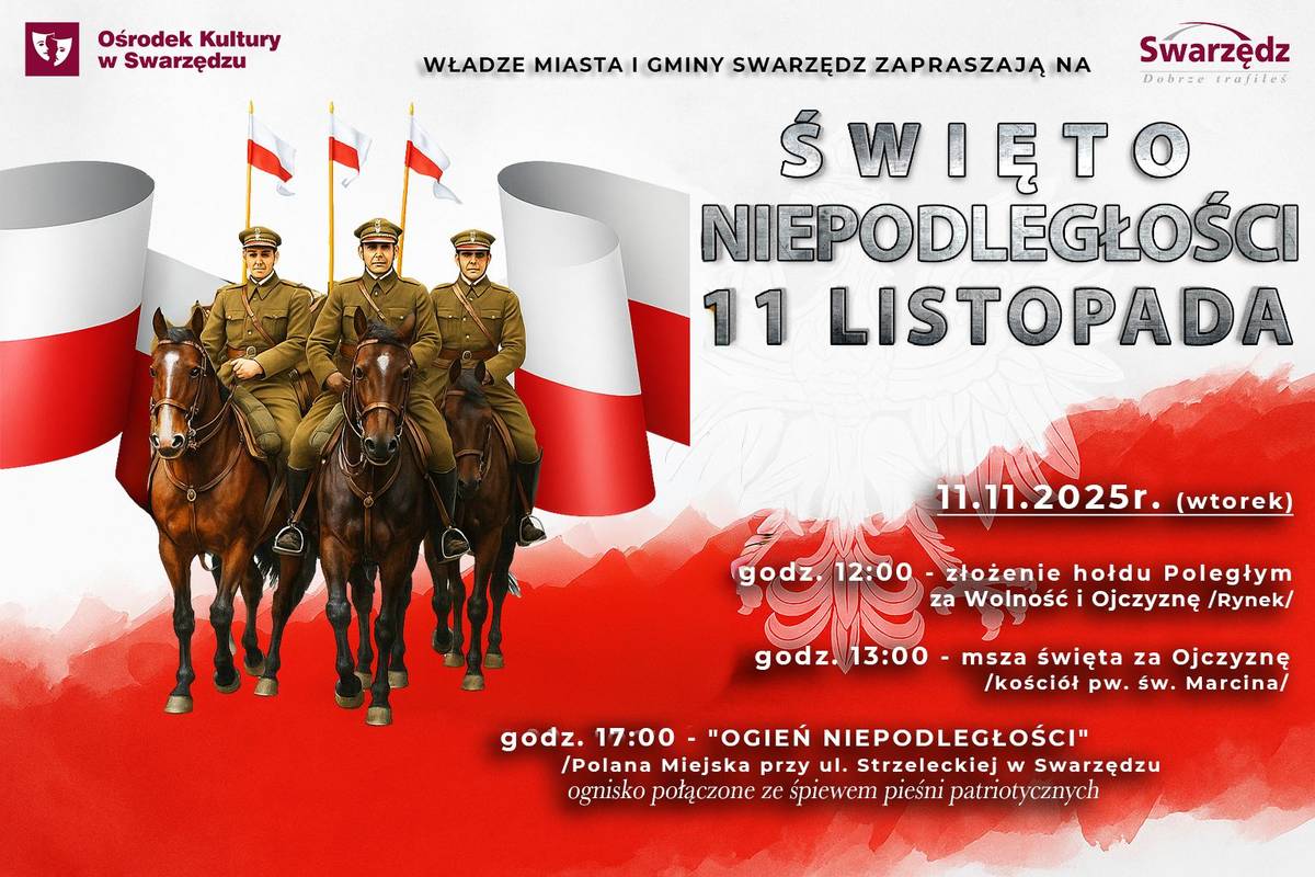 Władze Miasta i Gminy Swarzędz serdecznie zapraszają wszystkich mieszkańców Swarzędza do wspólnego świętowania 107 rocznicy odzyskania przez Polskę niepodległości.