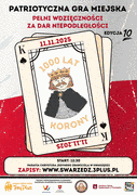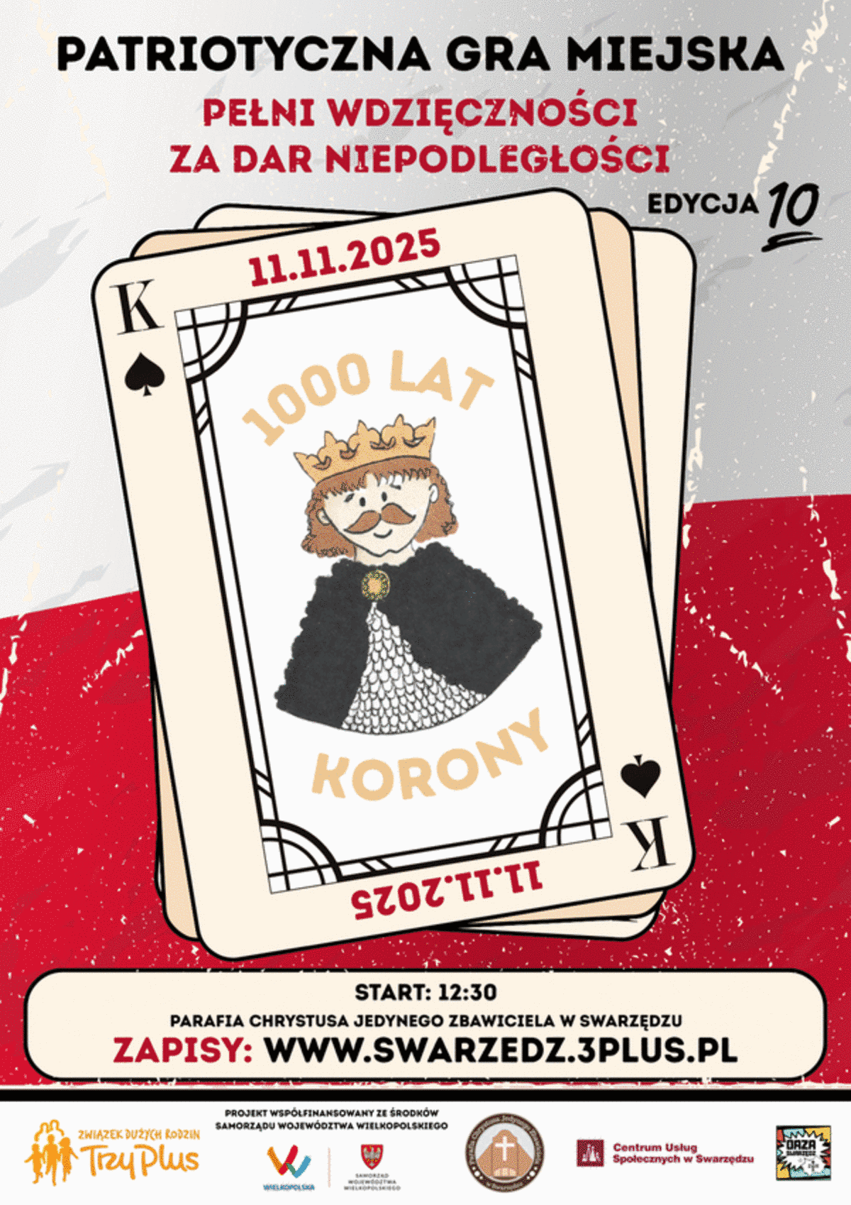 Z wielką radością ogłaszamy, że 11.11.2025 odbędzie się w Swarzędzu kolejna (już 10!) edycja Patriotycznej Gry Miejskiej "Pełni wdzięczności za dar NIEPODLEGŁOŚCI".