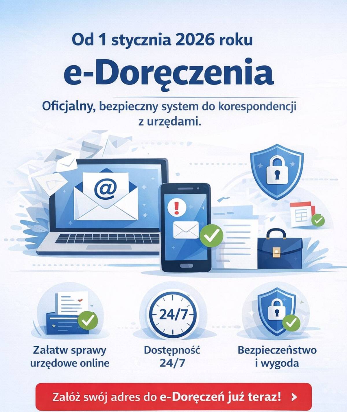 Od 1 stycznia 2026 roku podstawowym kanałem komunikacji dla podmiotów publicznych stają się e-Doręczenia. Usługa dostępna jest dla obywateli, przedsiębiorców, zawodów zaufania publicznego oraz podmiotów publicznych. e-Doręczenia to oficjalny, państwowy system cyfrowej korespondencji - odpowiednik listów poleconych za potwierdzeniem odbioru. Zapewniają bezpieczeństwo, wiarygodność i pełną moc prawną doręczanej korespondencji. System umożliwia wysyłanie i odbieranie pism urzędowych online - bez wizyt w urzędzie czy na poczcie, bez papieru i bez kolejek.