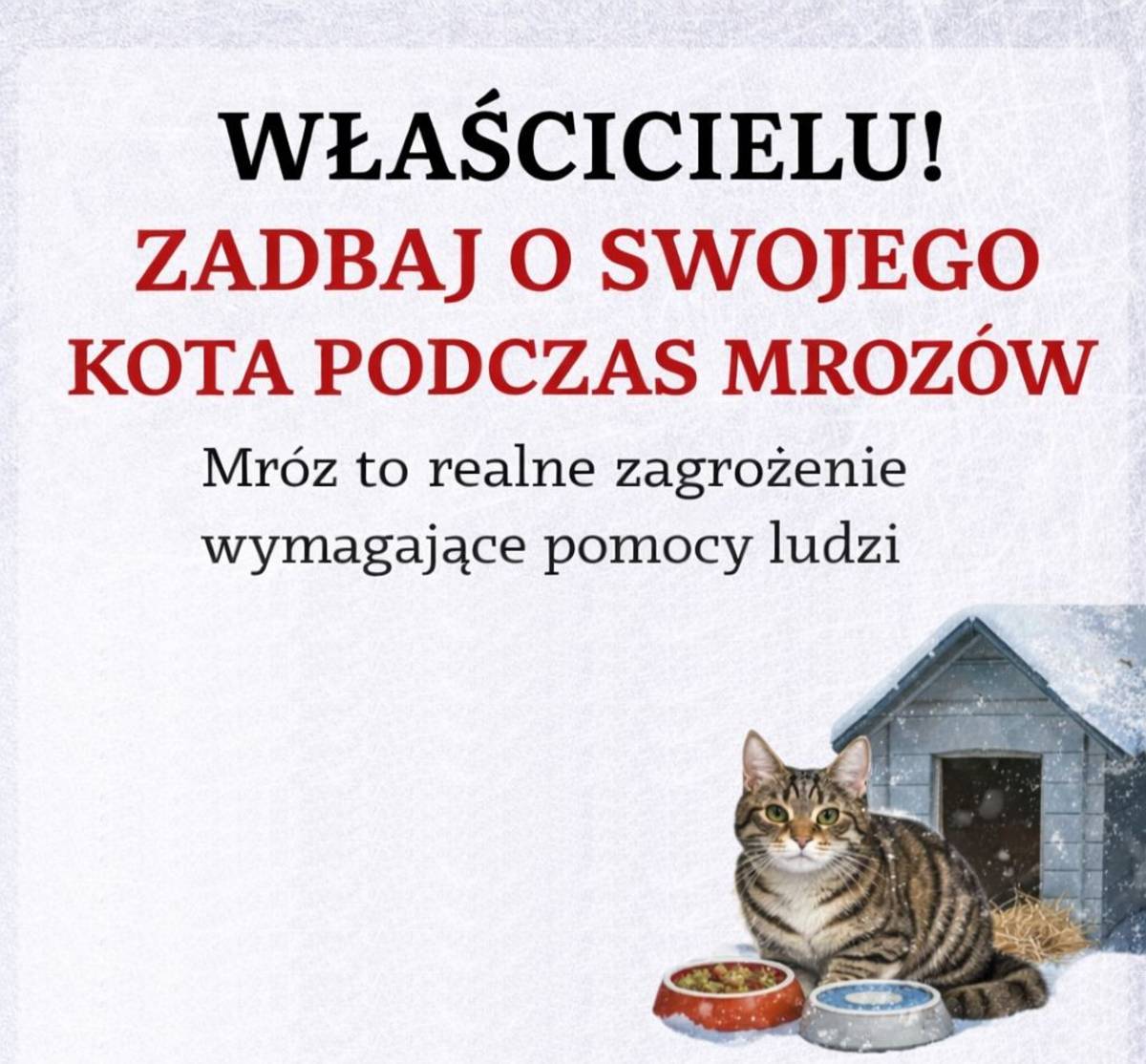 W okresie mrozów szczególnej uwagi wymagają również koty, zwłaszcza wolno żyjące. Fundacja apeluje, aby w miarę możliwości udostępniać im prowizoryczne schronienia, np. ocieplone budki, piwnice lub garaże, oraz zapewniać dostęp do pożywienia i wody. Nawet proste formy pomocy mogą znacząco zwiększyć ich szanse na bezpieczne przetrwanie zimowych dni.
