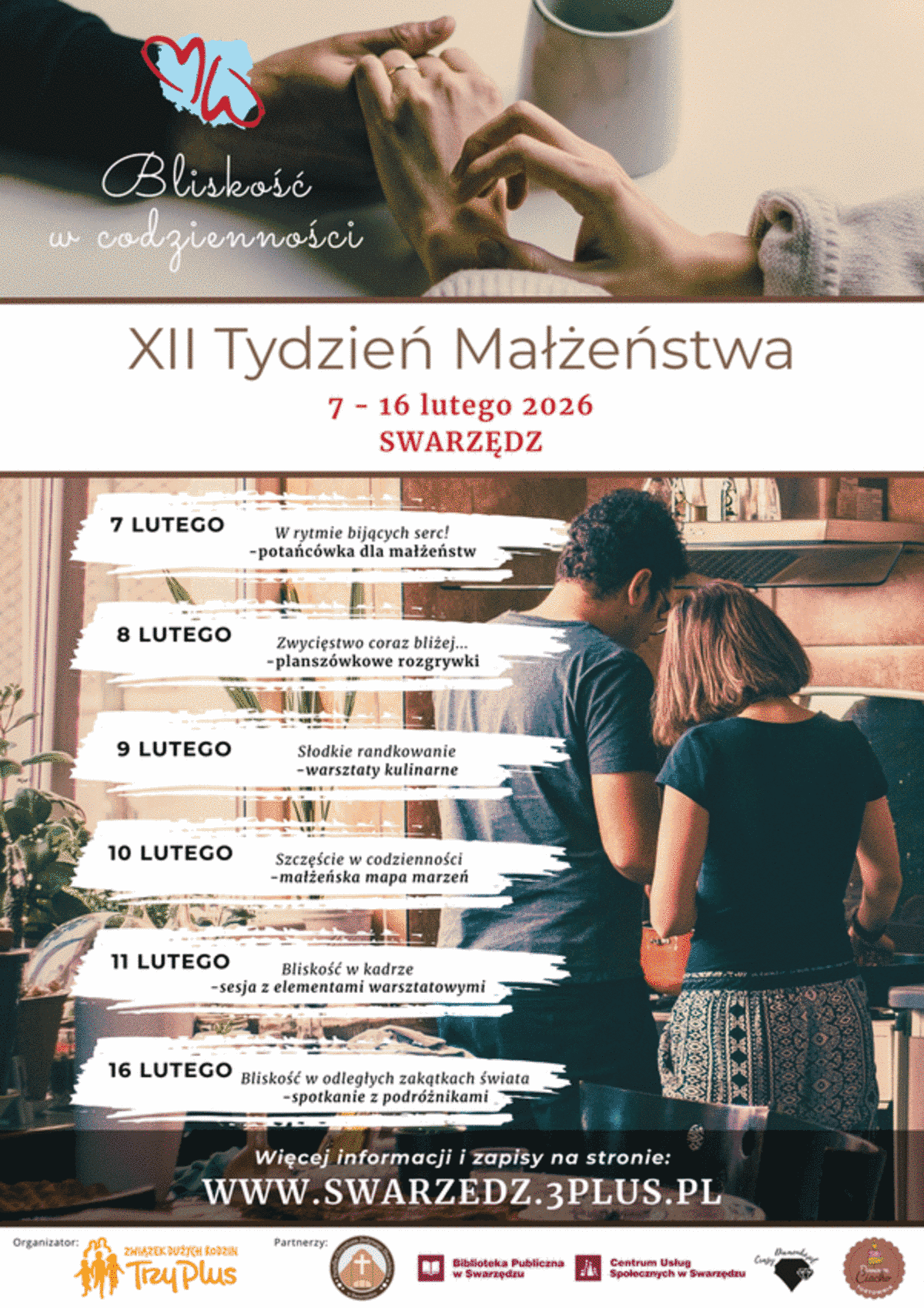 Co roku w tym czasie w wielu miastach w Polsce odbywa się szereg wydarzeń o charakterze edukacyjnym, kulturalnym, rekreacyjnym i rozrywkowym. Także w Swarzędzu przygotowaliśmy wiele zróżnicowanych propozycji małżeńskich randek, które mamy nadzieję będę przestrzenią do wzmocnienia relacji, pogłębiania bliskości, wspólnego wartościowego spędzanie czasu i radości z bycia razem.