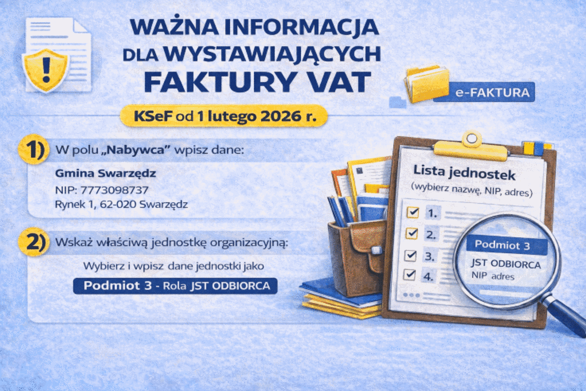 W związku z uruchomieniem od 1 lutego 2026 r. Krajowego Systemu e-Faktur (KSeF) prosimy wszystkich kontrahentów i podmioty wystawiające faktury VAT na rzecz jednostek organizacyjnych Gminy Swarzędz o stosowanie poniższych zasad.