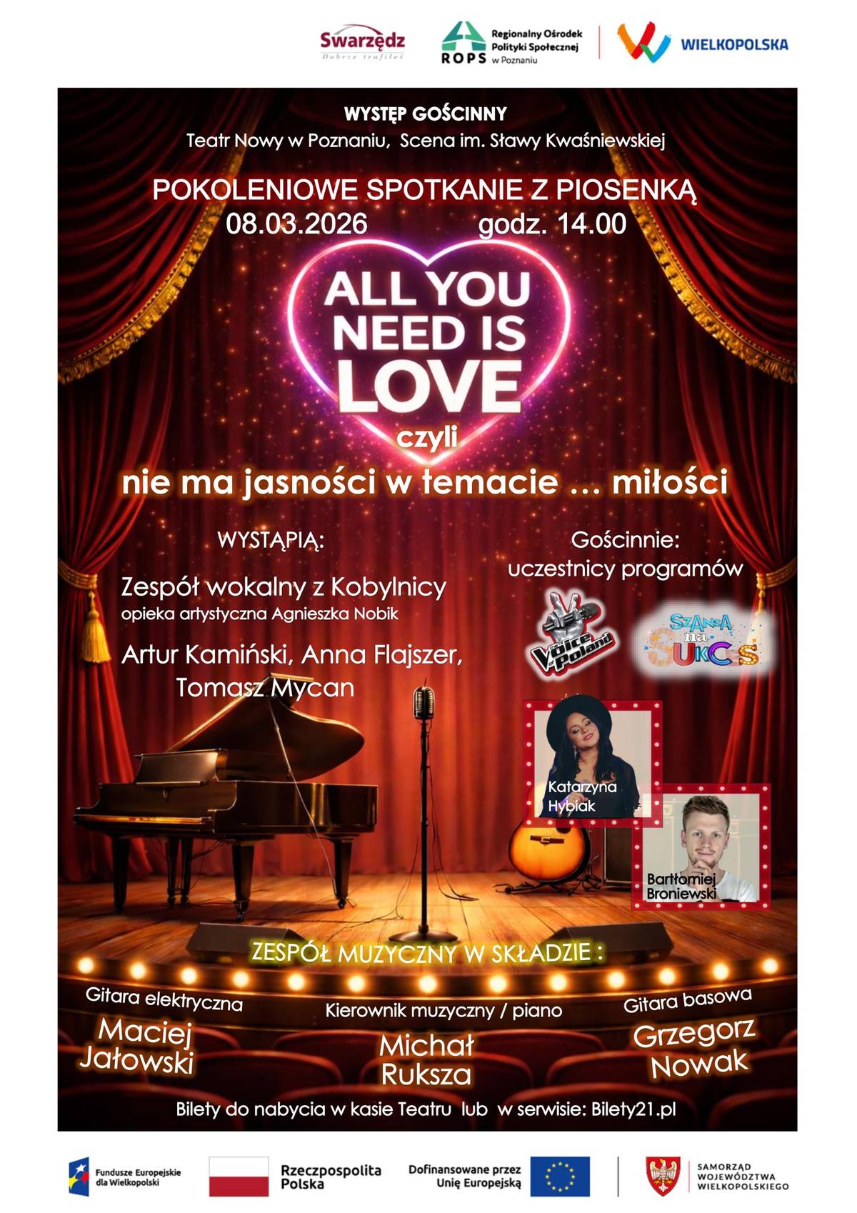 Pokoleniowe spotkanie z piosenką odbędzie się w niedzielę 8 marca o godz. 14:00 w Teatrze Nowym w Poznaniu. Realizacja tego wydarzenia nie byłaby możliwa bez wsparcia i zaangażowania naszych partnerów. Wydarzenie zostało zorganizowane dzięki wsparciu Centrum Usług Społecznych w Swarzędzu w ramach realizowanych Inicjatyw Oddolnych. Nieformalna grupa z sołectwa Kobylnica, wspierana przez Organizatora Społeczności Lokalnej z CUS w Swarzędzu, otrzymała dofinansowanie na realizację koncertu.